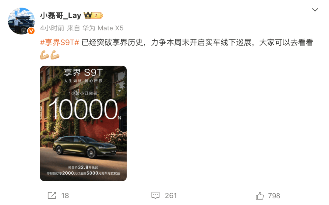 據了解,新車是享界汽車旗下第二款新車,也是鴻蒙智行旗下首款旅行車。享界S9T開啟預訂后,華為智選車產品總監(享界系列)彭磊在微博發文宣布,享界S9T已突破享界歷史,預訂1小時小訂破1萬臺,新車將爭取本周末開啟實車線下巡展。按計劃,新車將在9月上市。
