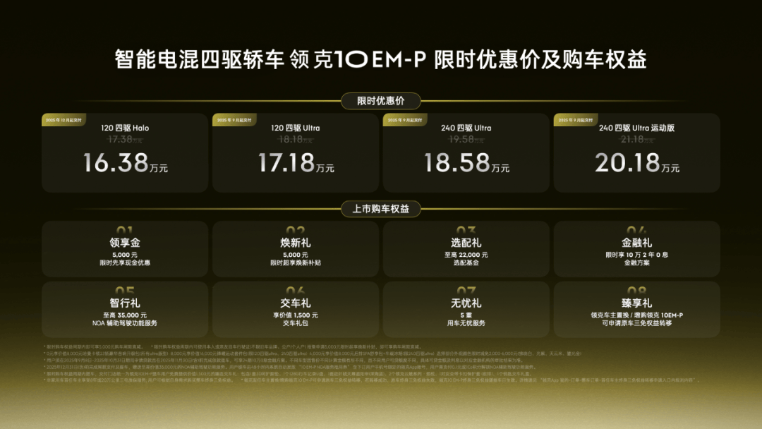 從定價與定位上來看,領克10 EM-P用“價值錨點”直面挑戰(zhàn)合資與新勢力。16.38萬—20.18萬元的限時優(yōu)惠,幾乎打到中高端電混轎車的腹地。對比比亞迪漢DM-i的高配、問界M7增程的入門版的售價與配置,領克10 EM-P在四驅、智駕和豪華配置上明顯“堆料”,實際形成的是30萬級別的體驗,下探至20萬區(qū)間。這樣的策略,本質是通過“高舉高打—下壓定價”的方式,塑造品牌的價值錨點。
