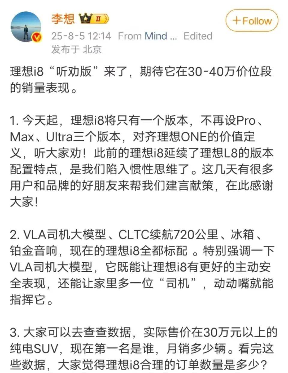或許是之前太順了,面對(duì)增程賽道大批“半價(jià)理想”的貼臉開(kāi)大,理想沒(méi)有予以重視,仍自信地認(rèn)為全新純電SUV產(chǎn)品能帶來(lái)第二增長(zhǎng)曲線,結(jié)果被現(xiàn)實(shí)狠狠打臉:i8定價(jià)超出消費(fèi)者預(yù)期,導(dǎo)致訂單啞火,后續(xù)企業(yè)緊急調(diào)價(jià),回歸單一配置,也無(wú)法彌補(bǔ)首發(fā)失利的影響。