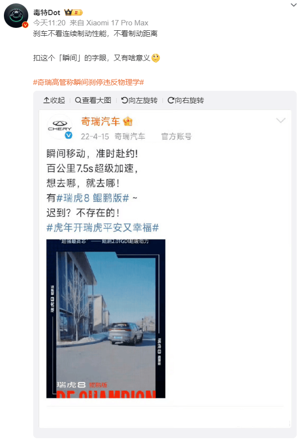 于是一個ID名為“毒特Dot”的網友搬出了一張奇瑞汽車于2022年4月15日發布的海報,其中使用了“瞬間移動,準時赴約!百公里加速7.5秒超級加速”的描述。