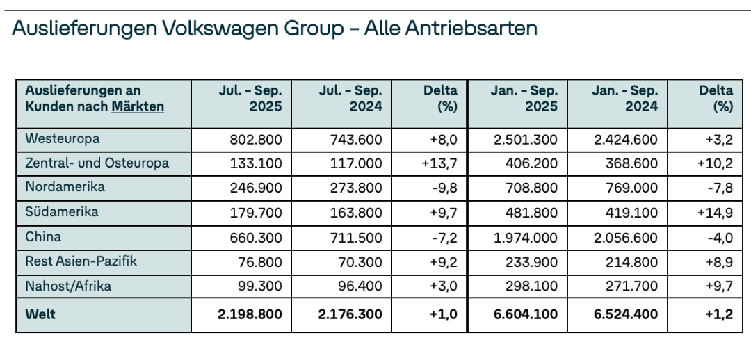 2025年第三季度,大眾汽車集團共交付汽車219.9萬輛,同比增長1.0%。從增長動力來看,部分具體車型在全球市場表現出色,為交付量增長做出了貢獻。不過,這樣的增長幅度在全球汽車市場快速發展的當下,顯得有些不盡人意。中國作為大眾汽車的重要市場,曾經為其全球銷量增長提供強大動力,但如今情況卻不容樂觀。第三季度,大眾汽車在中國市場的銷量出現下滑,同比下滑7.2%,為66.03萬輛。隨著中國自主品牌車企如比亞迪、奇瑞、吉利等的強勢崛起,市場競爭異常激烈。自主品牌在新能源汽車領域憑借性價比優勢、先進的電池技術和智能化配置,迅速搶占市場份額。大眾汽車在面對這些競爭對手時,在產品價格、智能化水平等方面的優勢不再明顯,導致其市場份額被逐步擠壓。